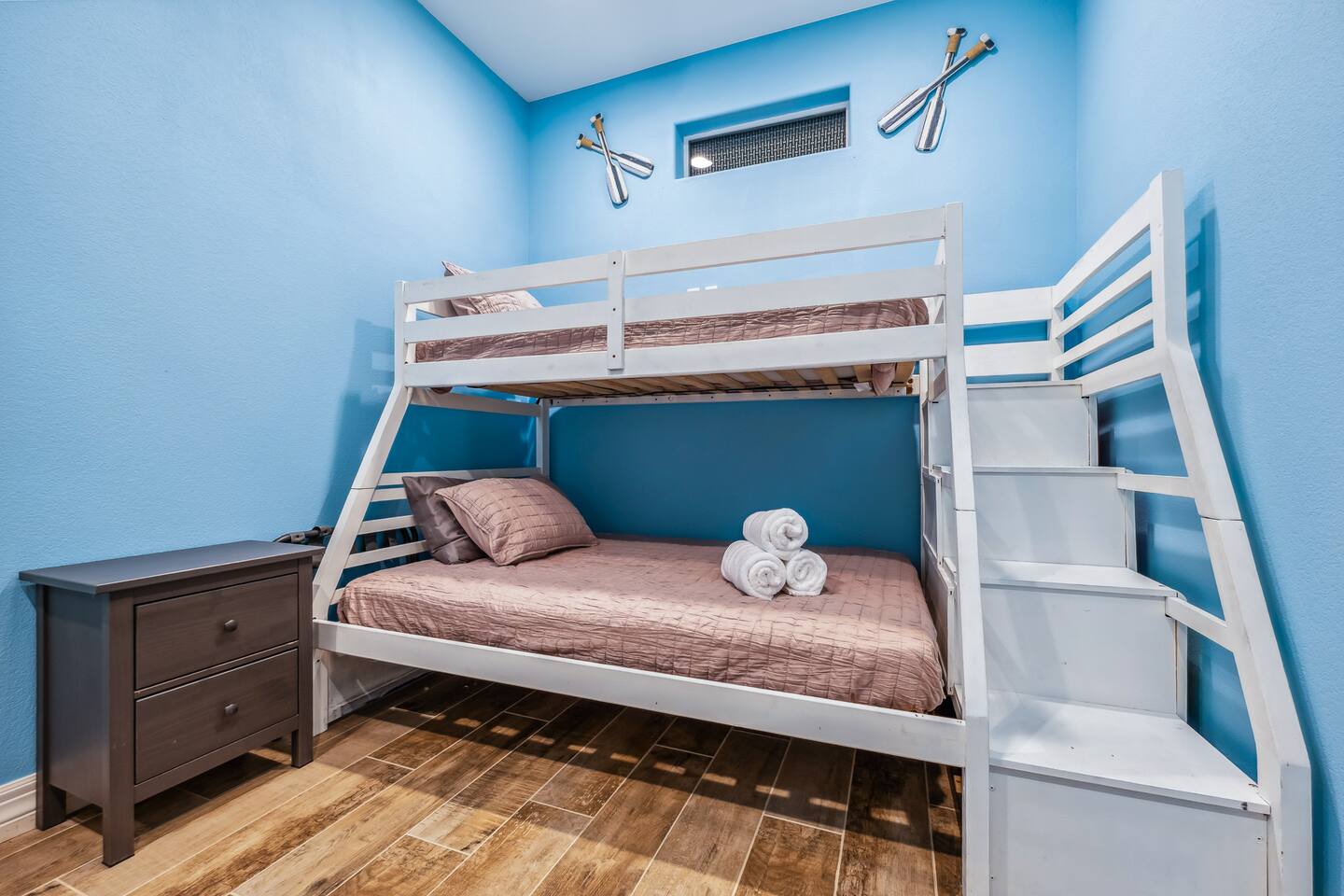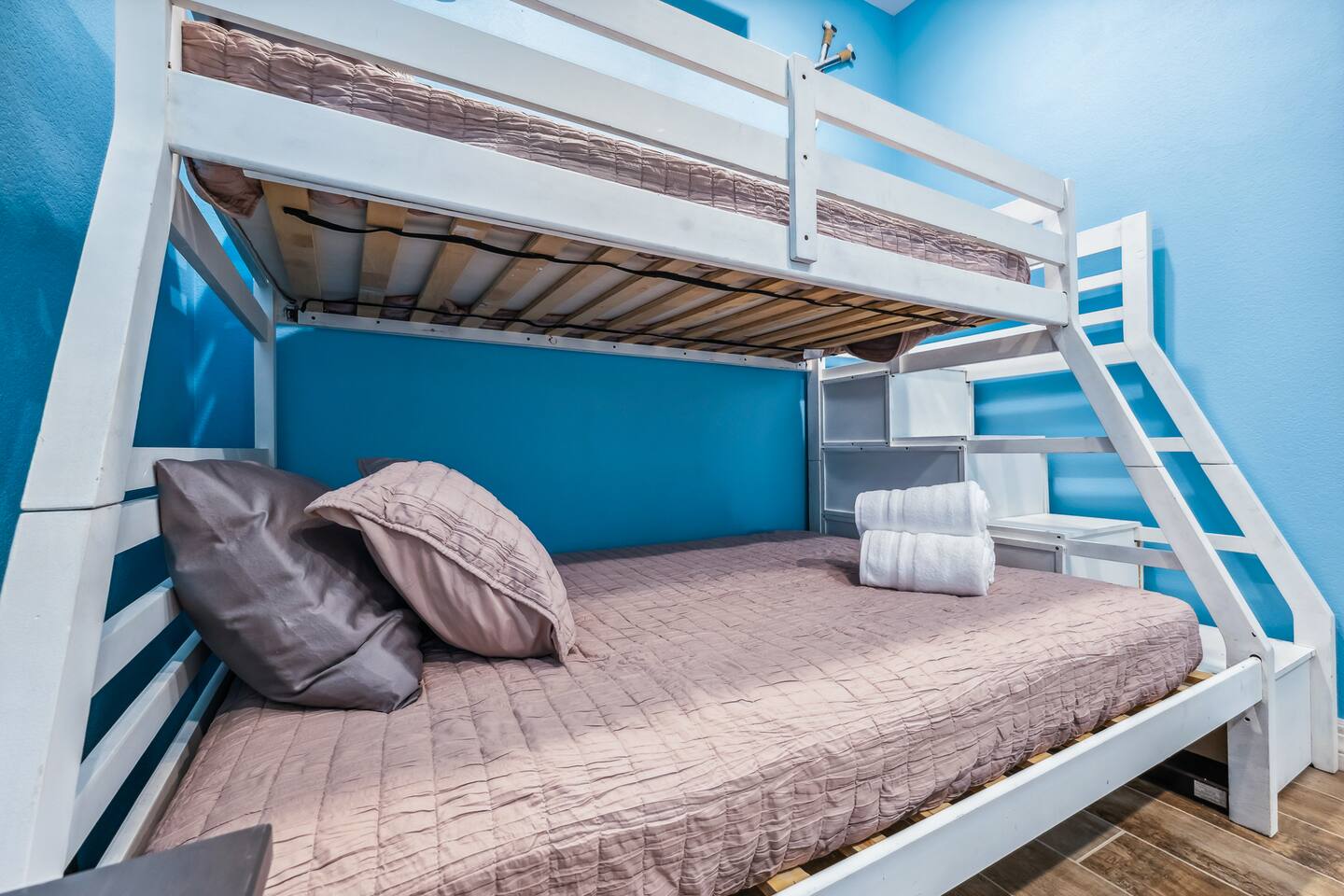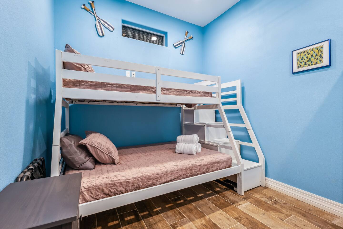 Master bedroom: King bed (sleeps 2) Bedroom 2: Queen bed (sleeps 2) Bedroom 3: Queen bed (Sleeps 2) Bedroom 4: Twin-over-full bunk bed (sleeps 3) Total: 5 beds (sleeps 9)