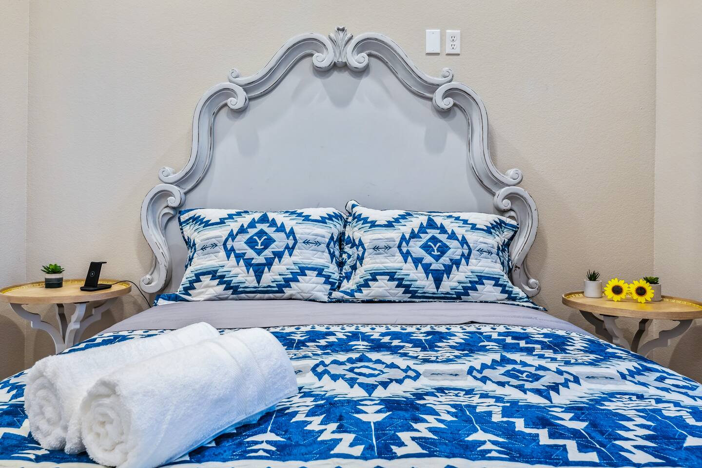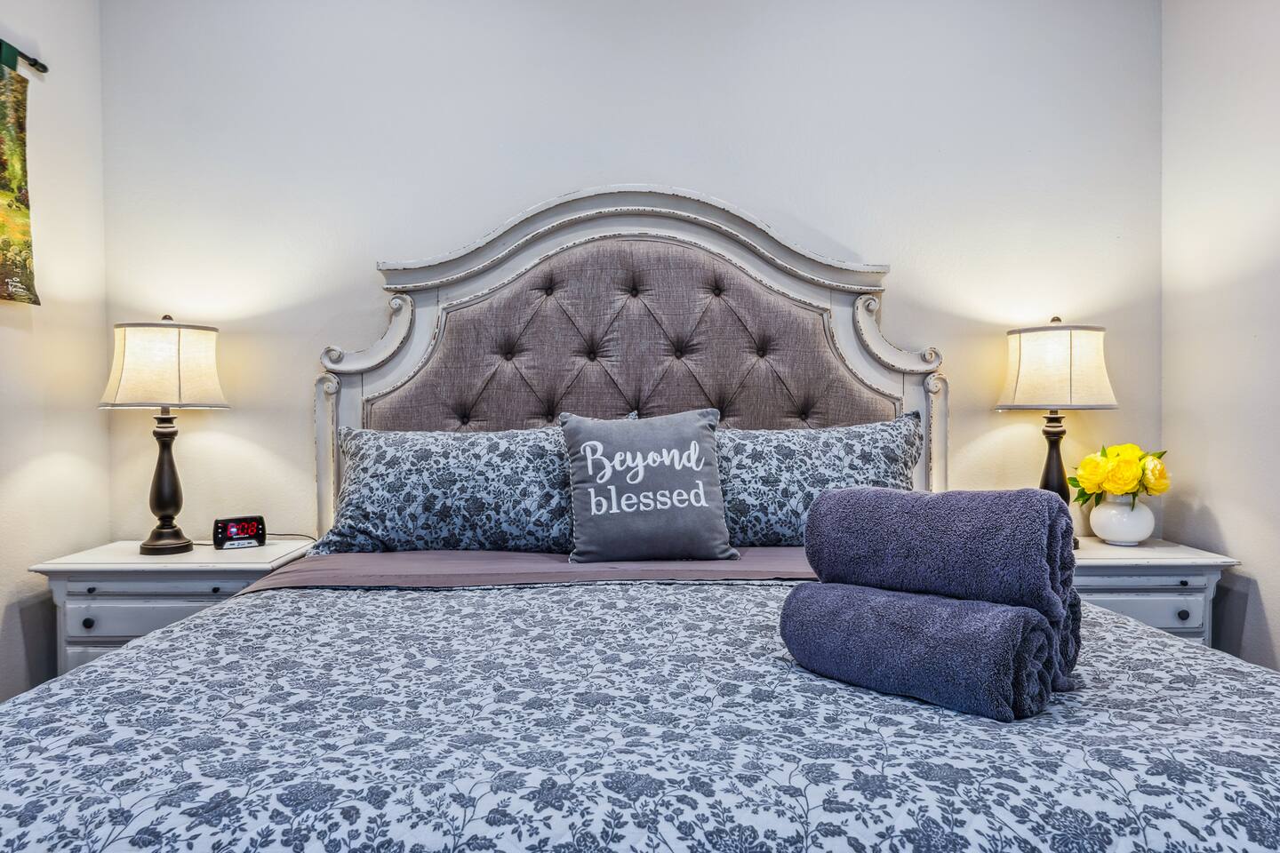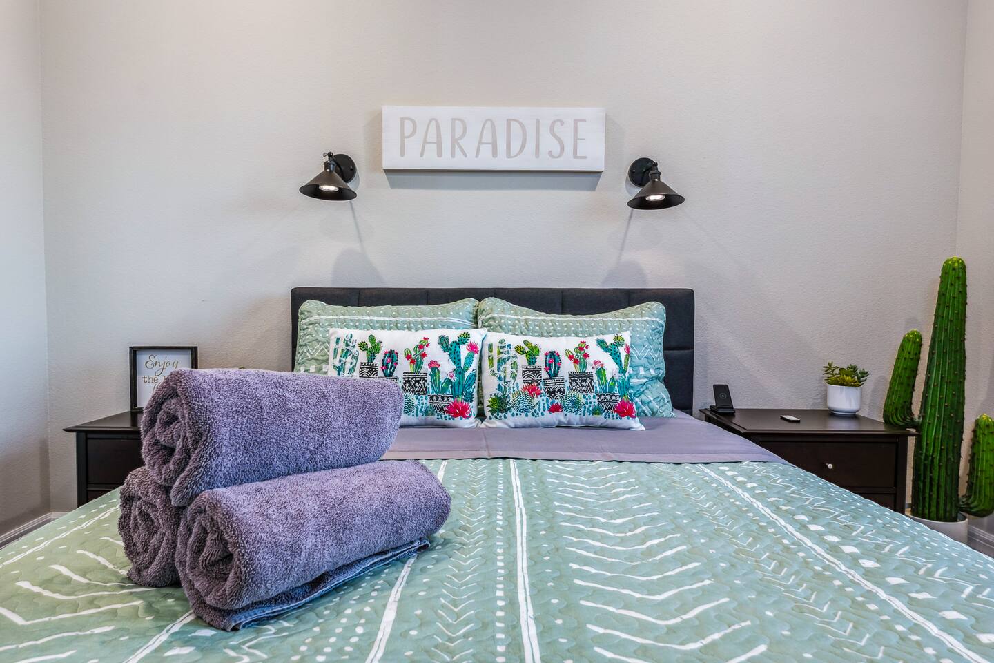 Master bedroom: King bed (sleeps 2) Bedroom 2: Queen bed (sleeps 2) Bedroom 3: Queen bed (Sleeps 2) Bedroom 4: Twin-over-full bunk bed (sleeps 3) Total: 5 beds (sleeps 9)